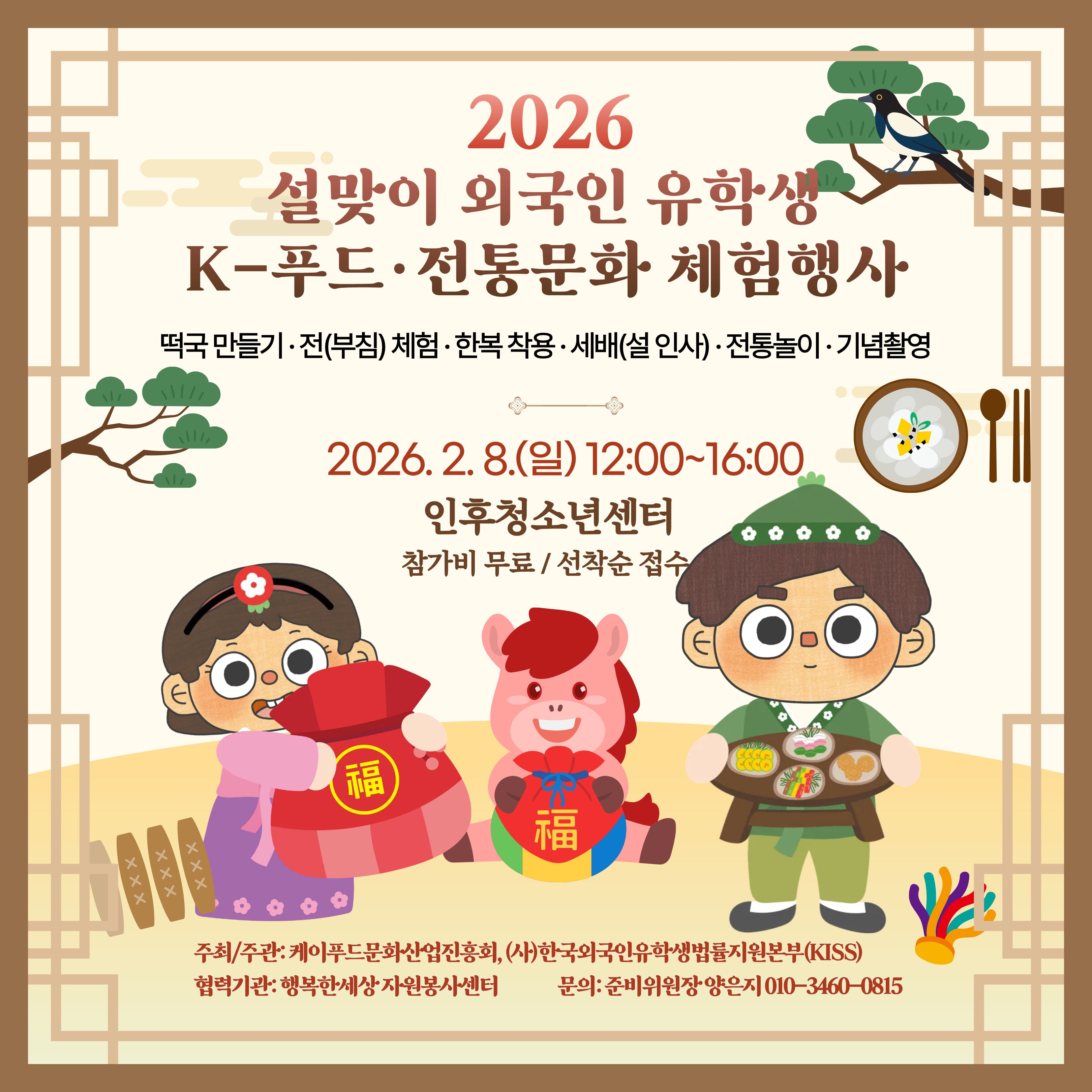 | [보도] 법률지원본부·케이푸드문화산업진흥회, 전주서 ‘설맞이 외국인 유학생 K-푸드·전통문화 체험행사’ 성료 (0) | 2026.02.09 |